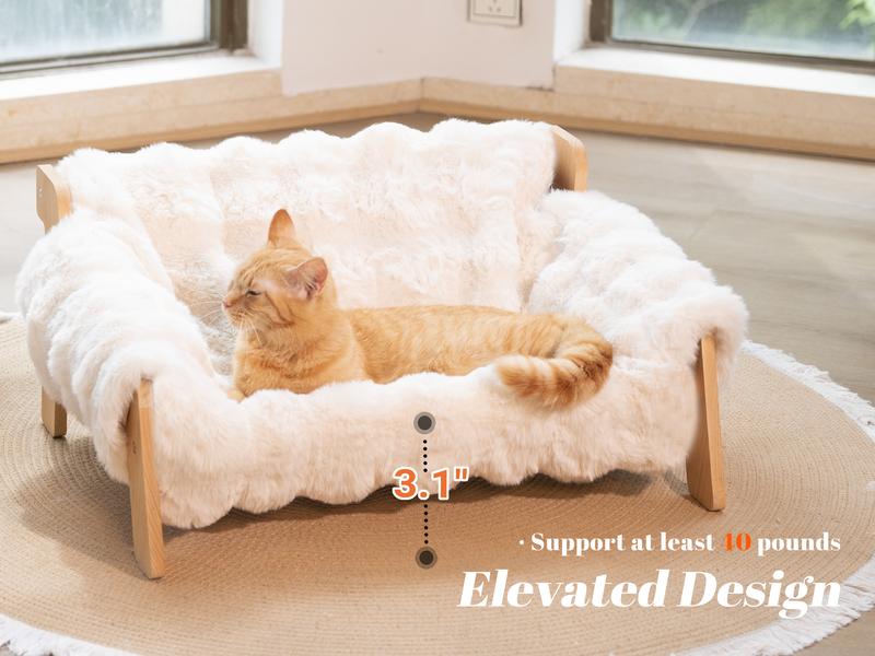 Elevated Pet Couch Bed, Wooden Cat and Small Dog Sofa, Removable Washable Fluffy Cover Raised, Kitty Lounge Chair Suitable for Puppy for Indoor